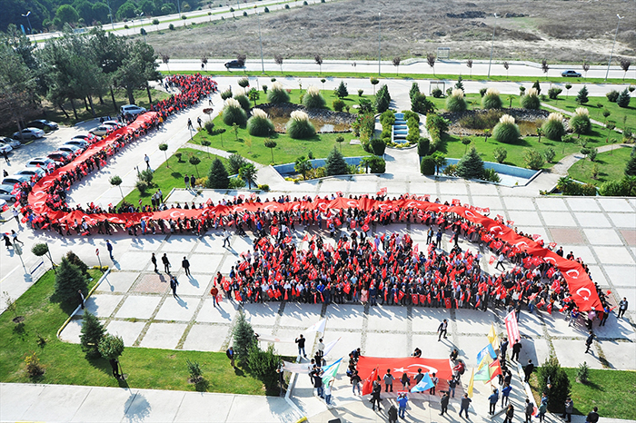 Rektörlük binası önünde İstiklal Marşı okunması ve saygı duruşuyla biten yürüyüşte, İlahiyat Fakültesi öğretim üyeleri tarafından Fetih Suresi okundu.